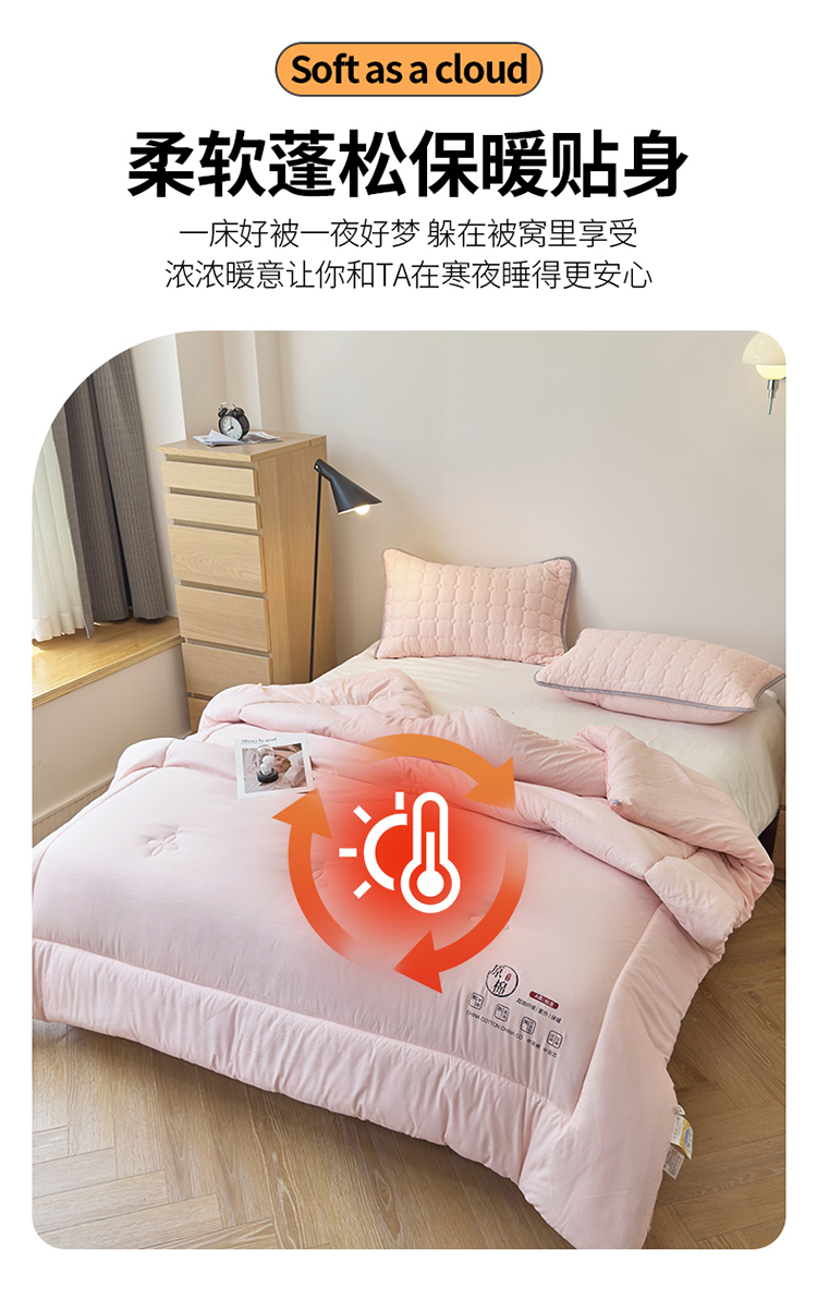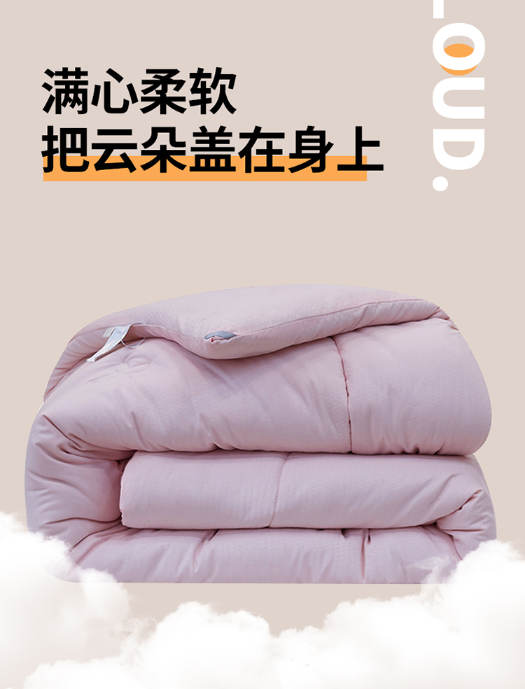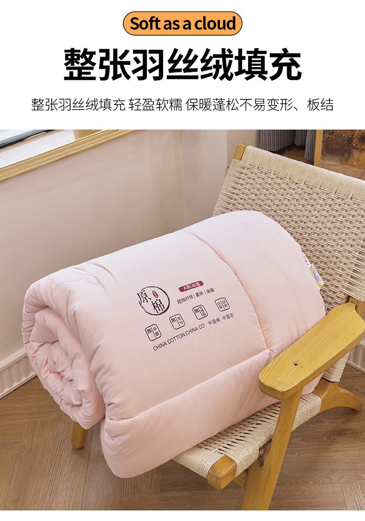 整张羽丝绒填充,轻盈软糯,保暖蓬松不易变形、板结。