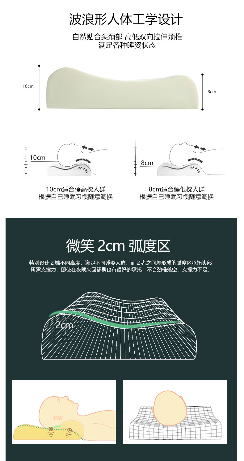 3.两种高度满足不同需求, 10cm适合仰睡人群,8cm适合侧睡人群,自然贴合肩部,充分填充肩部与颈部缝隙。