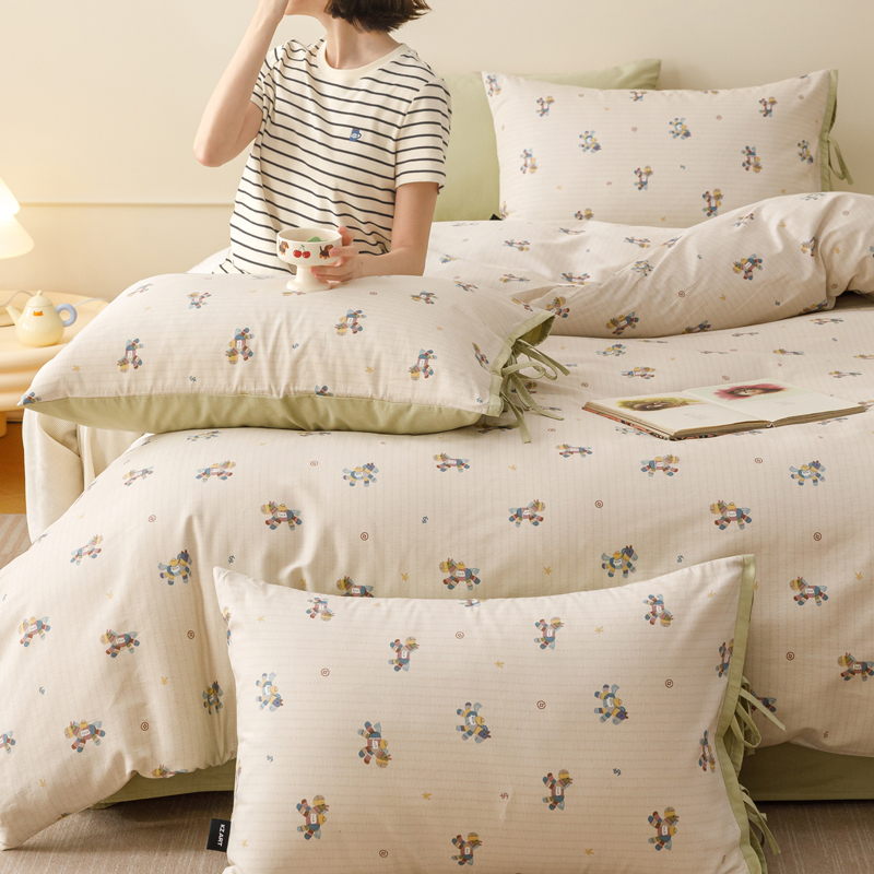 春夏全棉奶油小卡通印花绑带款四件套